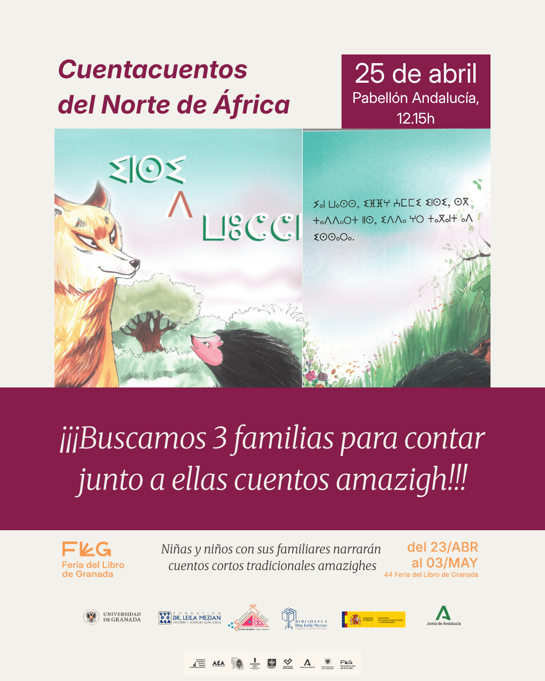 La Cátedra Internacional Dra. Leila Mezian de Cultura Amazigh organiza un cuentacuentos en el marco de la Feria del Libro de Granada 2026 y, para ello, busca familias (niños y niñas acompañadas de sus familiares adultos) que participen como narradores y personajes de cuatro cuentos tradicionales amazighes traducidos al castellano.