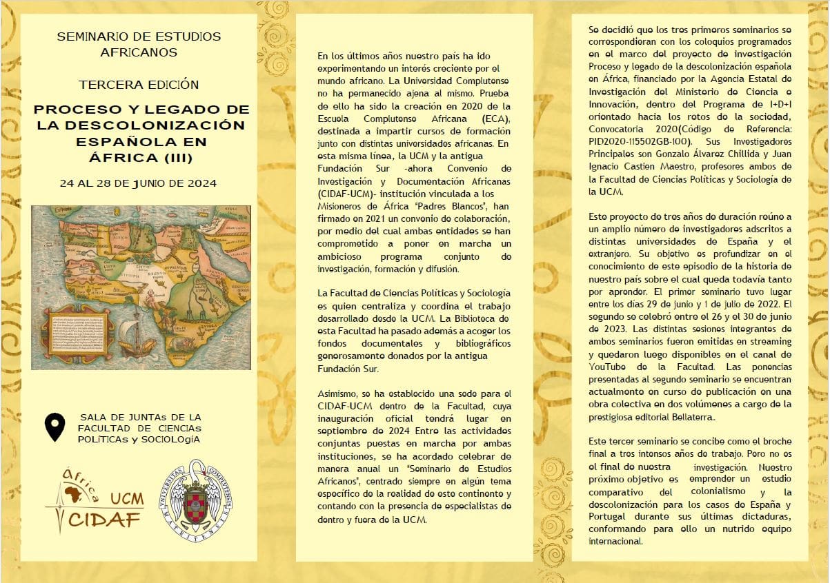 Se decidió que los tres primeros seminarios se correspondieran con los coloquios programados en el marco del proyecto de investigación Proceso y legado de la descolonización española en África, financiado por la Agencia Estatal de Investigación del Ministerio de Ciencia e Innovación, dentro del Programa de I+D+I orientado hacia los retos de la sociedad, Convocatoria 2020(Código de Referencia: PID2020-115502GB-100). Sus Investigadores Principales son Gonzalo Álvarez Chillida y Juan Ignacio Castien Maestro, profesores ambos de la Facultad de Ciencias Políticas y Sociología de la UCM.